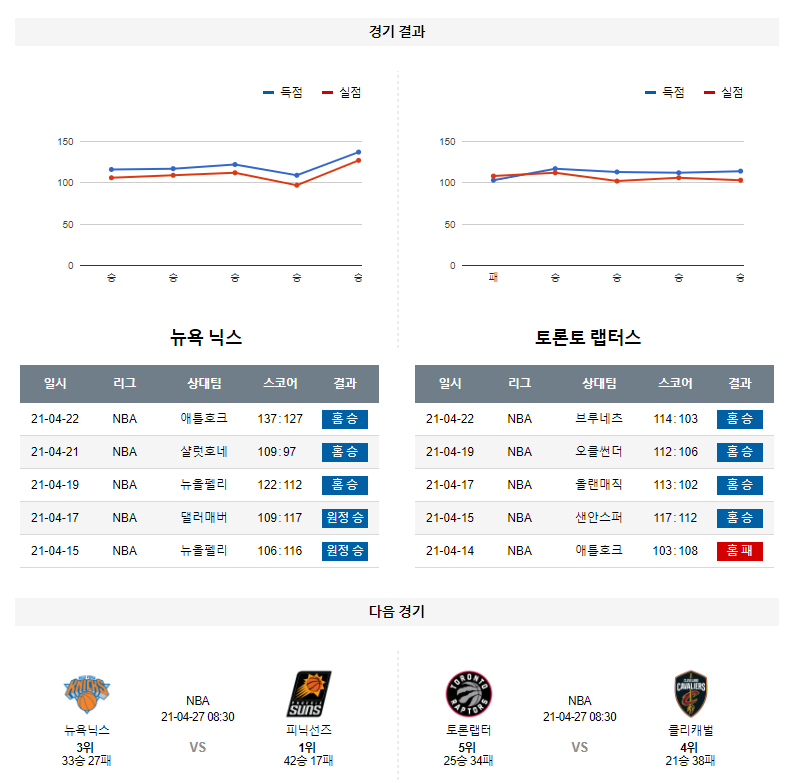 올시즌 맞대결에서는 1차전 토론토(홈) 100-83 승리, 2차전 뉴욕(홈) 102-96 승리의 결과가 나왔다. 3차전은 5점차 이내 박빙의 승부가 예상된다.