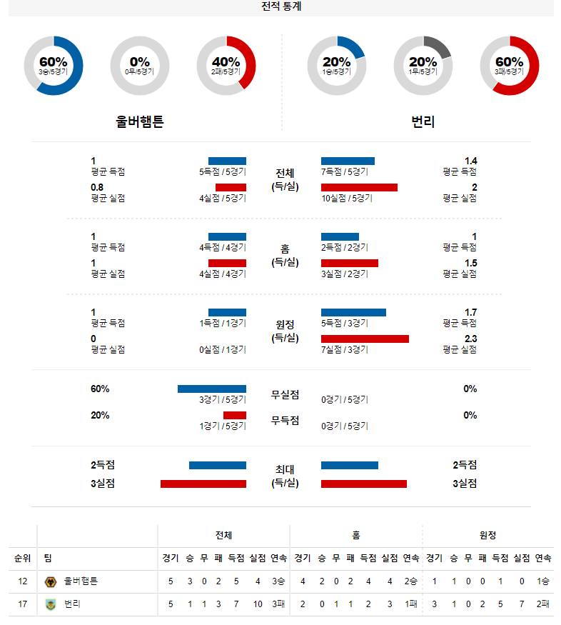 1. 최근 6경기 맞대결 : 6전 2승 3무 1패 7득점 5실점 (번리 우세)