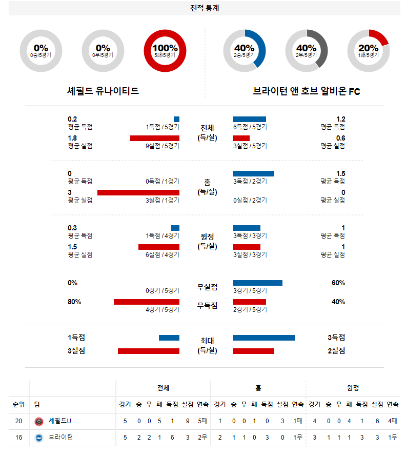2. 셰필드 이번 시즌 홈 성적 : 16전 3승 1무 12패 (무실점 비율 : 13%, 무득점 비율 : 50%)