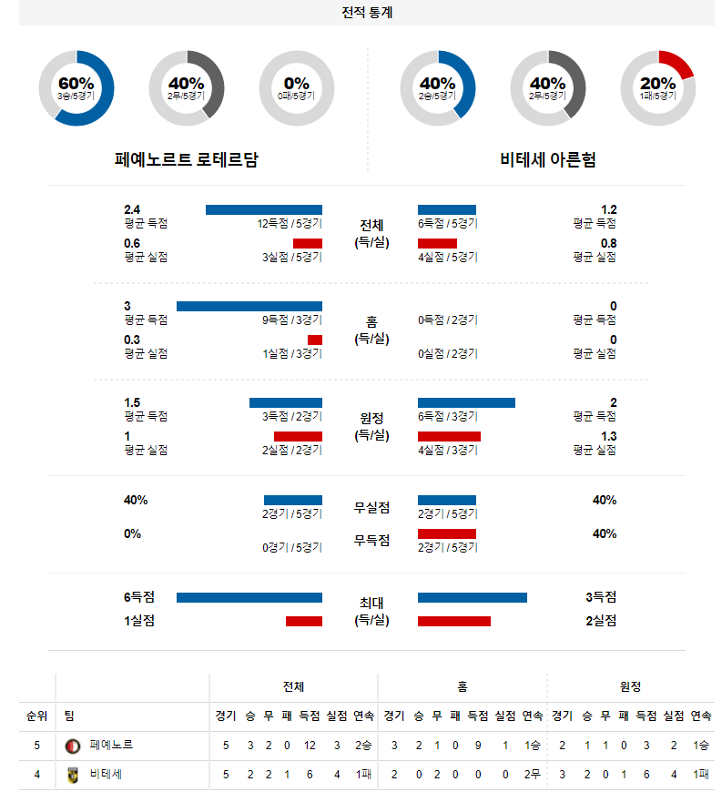 1. 최근 6경기 맞대결 : 6전 2승 2무 2패 5득점 6실점 (동률, 페예노르트 기준)