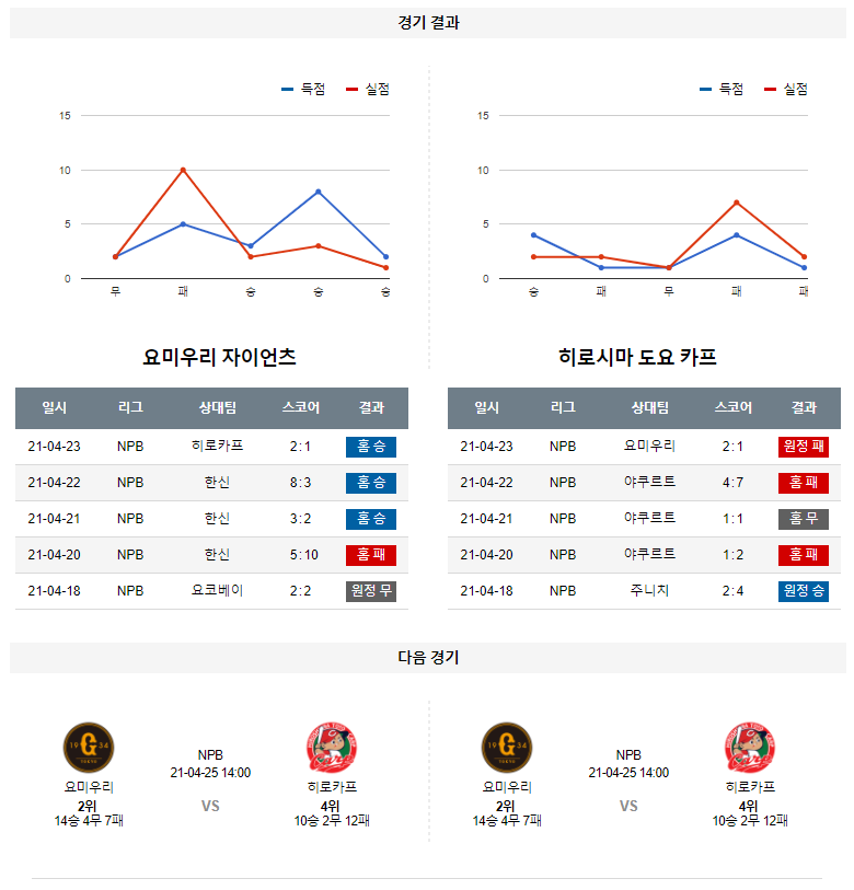 전일 경기에서는 요미우리가 2-1 승리를 기록하며 시리즈 기선제압에 성공했다. 3연승 흐름 속에 시즌 14승4무7패 성적. 선발 스가노 토모유키 투수가 1실점 완투승을 기록했고 포수 T.오시로가 3안타(1홈런)을 기록한 경기. 반면, 히로카프는 최근 4경기 1무3패 흐름 속에 시즌 9승2무12패 성적. 구리 아렌 투수가 역투를 펼쳤지만 타선의 지원을 받지 못했고 수비 실책이 연속 이어지고 있다는 것도 불만이 된다.