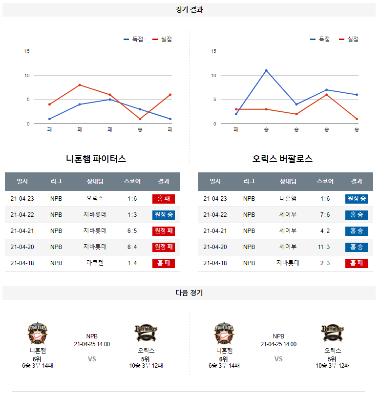 전일 경기에서는 오릭스 6-1 승리를 기록하며 시리즈 기선제압에 성공했다. 4연승 흐름 속에 시즌 10승3무11패 성적. 10안타(1홈런)를 기록한 타선이 올시즌 연속 되는 호투에도 불구하고 타선의 지원을 받지 못하고 있던 야마오카 타이스케 투수를 화끈하게 지원해준 경기. 반면, 나혼햄은 최근 5경기 1승4패 흐름 속에 시즌 6승3무14패 성적. 수비 실책이 빌미가 되어서 허용하지 않아도 되는 3실점을 헌납하고 이날 경기에서 마운드에 올라온 3명의 투수가 모두 실점을 허용한 경기에서 승리를 기대하는 것은 욕심이 되었던 하루.