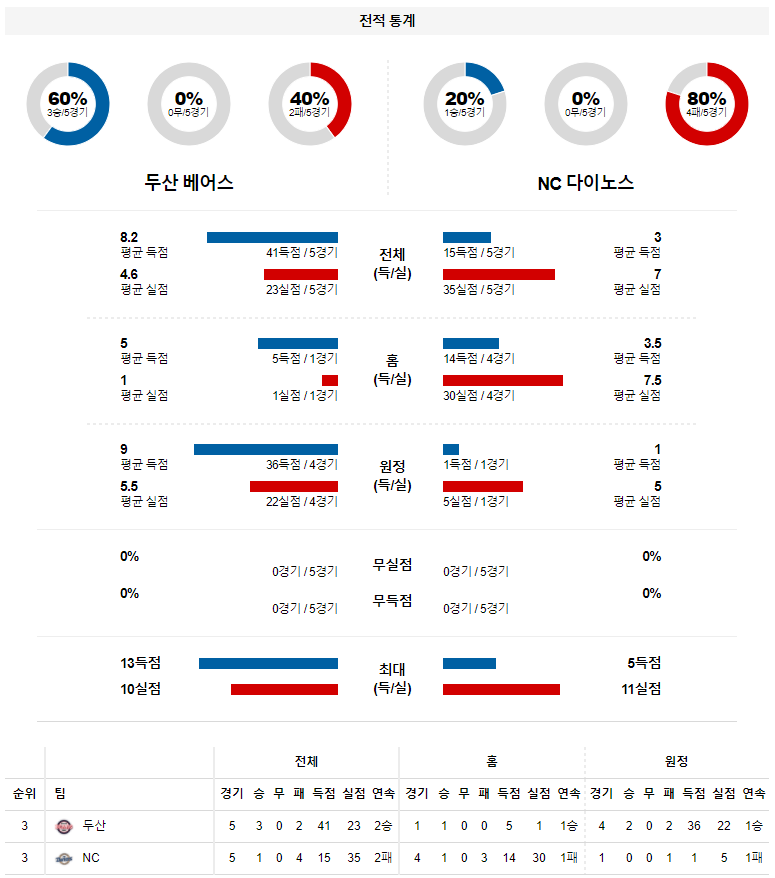 직전 경기에서 1-5 패배를 당한 NC는 강동연을 앞세워 반전을 노린다. 강동연은 지난 SSG 전에서 5이닝 2피안타 1피홈런 1사사구 4탈삼진 1자책점을 기록하며 압도적인 피칭을 선보였다. 올 시즌 2경기에 나와 2승 ERA 1.08을 기록하며 압도적인 피칭을 선보이고 있다. 하지만 지난 시즌 두산을 상대로 3경기에 나와 3패 ERA 13.50을 기록하며 최악의 피칭을 선보였던 만큼 이번 경기에서 무너질 가능성이 높다. 게다가 직전 경기에서 류진욱이 2실점을 내줬다는 점도 불안하다.