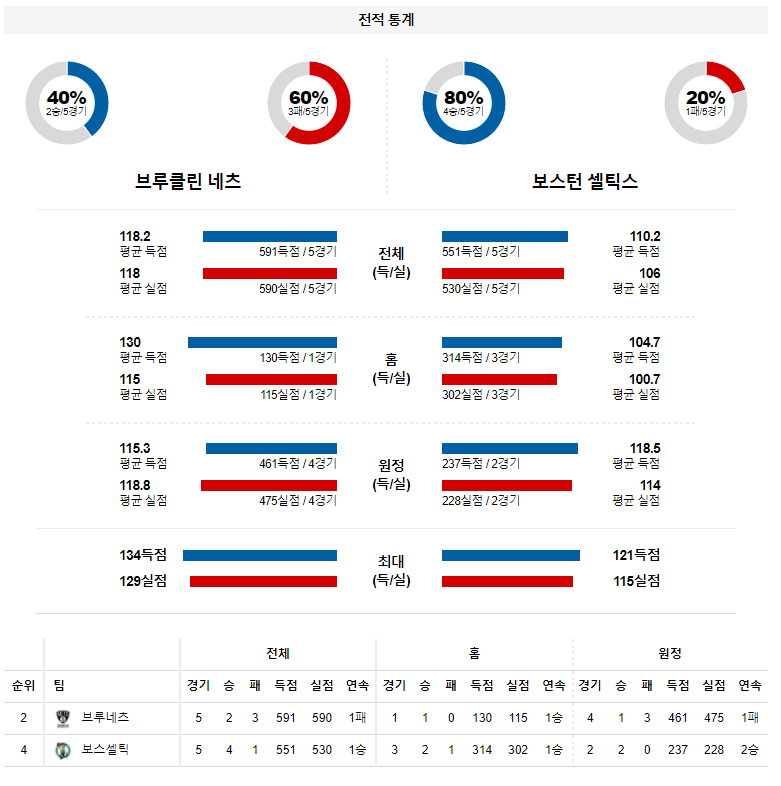 제임스 하든에 이어서 케빈 듀란트 까지 부상으로 쓰러지면서 브루클린은 카이리 어빙이 혼자서 북치고 장구 치고 꽹과리까지 쳐야 한다. 보스턴이 백투백 원정이라는 것을 감안하더라도 밀리는 전력 이라고 볼수 없다. 보스턴 승리 가능성을 추천 한다.