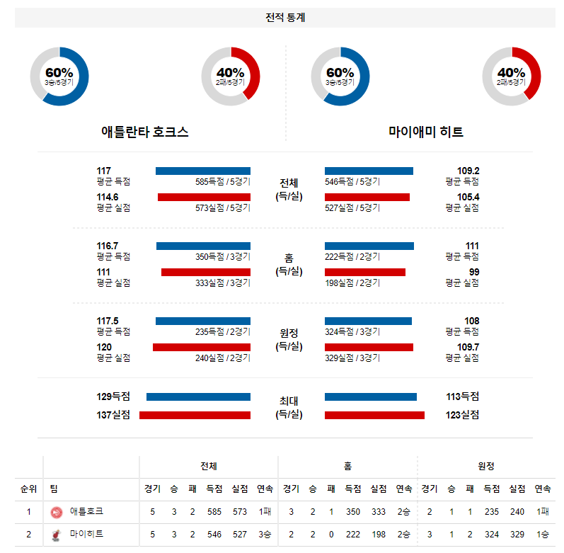 올시즌 상대전에서는 1차전 마이애미(홈) 109-99 승리, 2차전 애틀란타(원정) 94-80 승리를 기록하며 1승1패의 결과가 나왔다. 1,2차전 모두 패배를 기록한 팀이 두 자리수 득점에 머물렀던 상황.