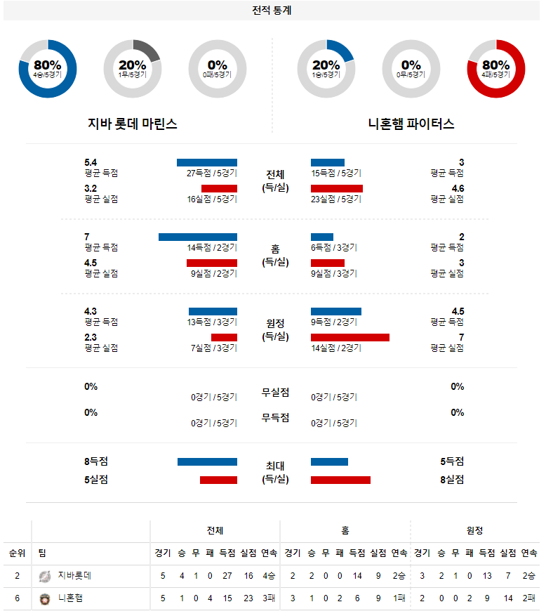 직전 경기에서 6-5 승리를 거둔 지바 롯데는 이와시타 타이를 앞세워 기세를 이어가려 한다. 이와시타는 지난 라쿠텐 전에서 5이닝 2피안타 4사사구 5탈삼진 무실점을 기록하며 완벽한 피칭을 선보였다. 올 시즌 3경기에 나와 2승 1패 ERA 2.12를 기록하며 수준급의 피칭을 선보이고 있는 만큼 이번 경기에서 호투를 펼칠 가능성이 높다. 게다가 직전 경기에서 타나카 야스히로, 도이 히데토, 사사키 치하야가 무실점 피칭을 선보였다는 점도 긍정적인 부분이다.
