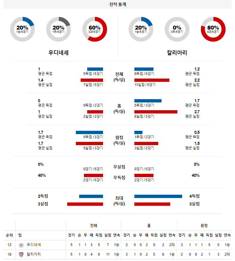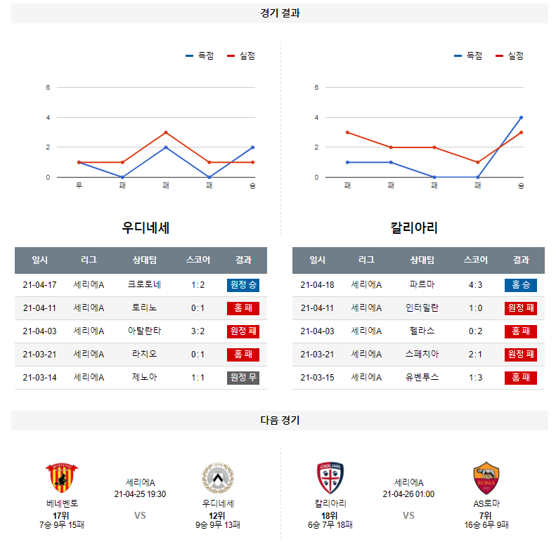 1. 최근 6경기 맞대결 : 6전 4승 1무 1패 9득점 5실점 (우디네세 우세)