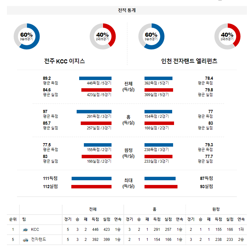 KCC에게 -5.5점의 핸디캡이 주어졌다. 대학과 실업팀을 상대로 3차례 연습경기 일정을 소화했지만 실전 경기 감각에 물음표가 붙어 있는 1차전 경기 초반이 가장 힘들수 밖에 없는 전주KCC라는 것을 감안한다면 핸디캡 승부에서는 전자랜드의 손을 들어줄수 있는 경기다. 또한, 상대전 맞춤형 수비 전술이 가장 효과를 볼수 있는 1차전이 되는 만큼 언더 가능성을 추천 한다.