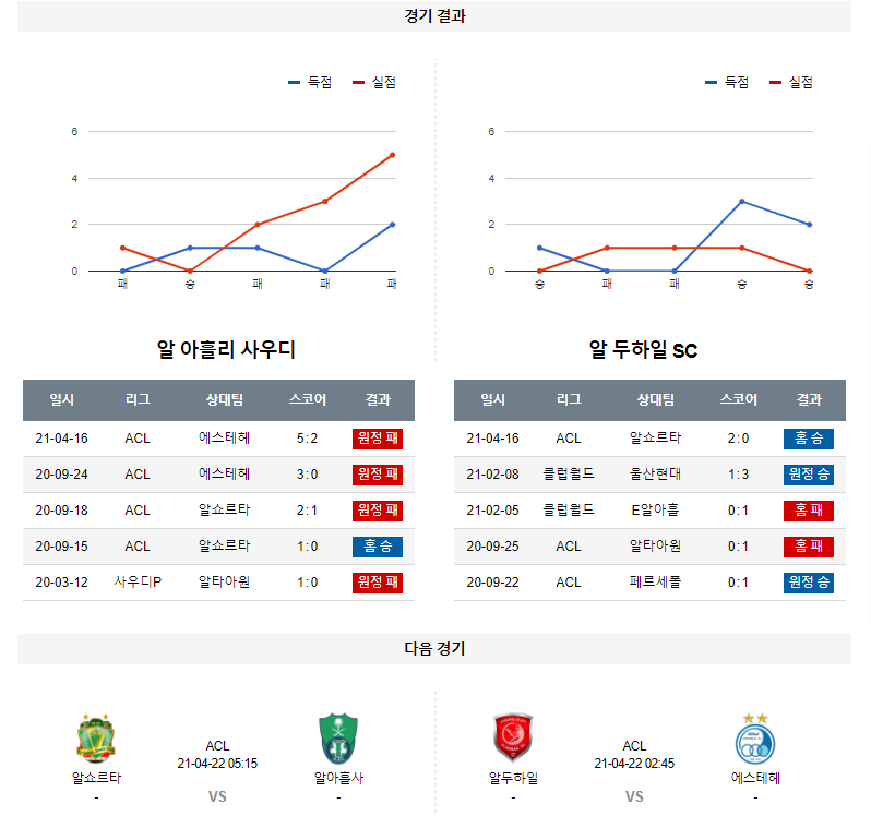 1. 최근 2경기 맞대결 : 2전 1승 1패 3득점 1실점 (동률, 알아흘리 기준)