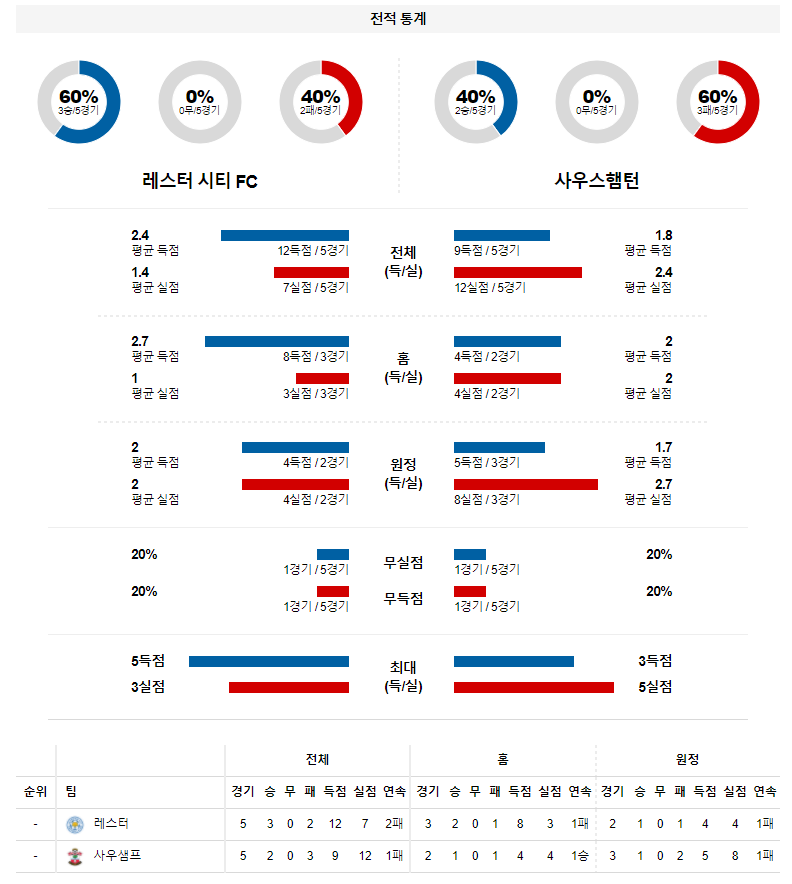 2. 레스터 시티 이번 시즌 홈 성적 : 15전 7승 1무 7패 (무실점 비율 : 27%, 무득점 비율 : 27%)