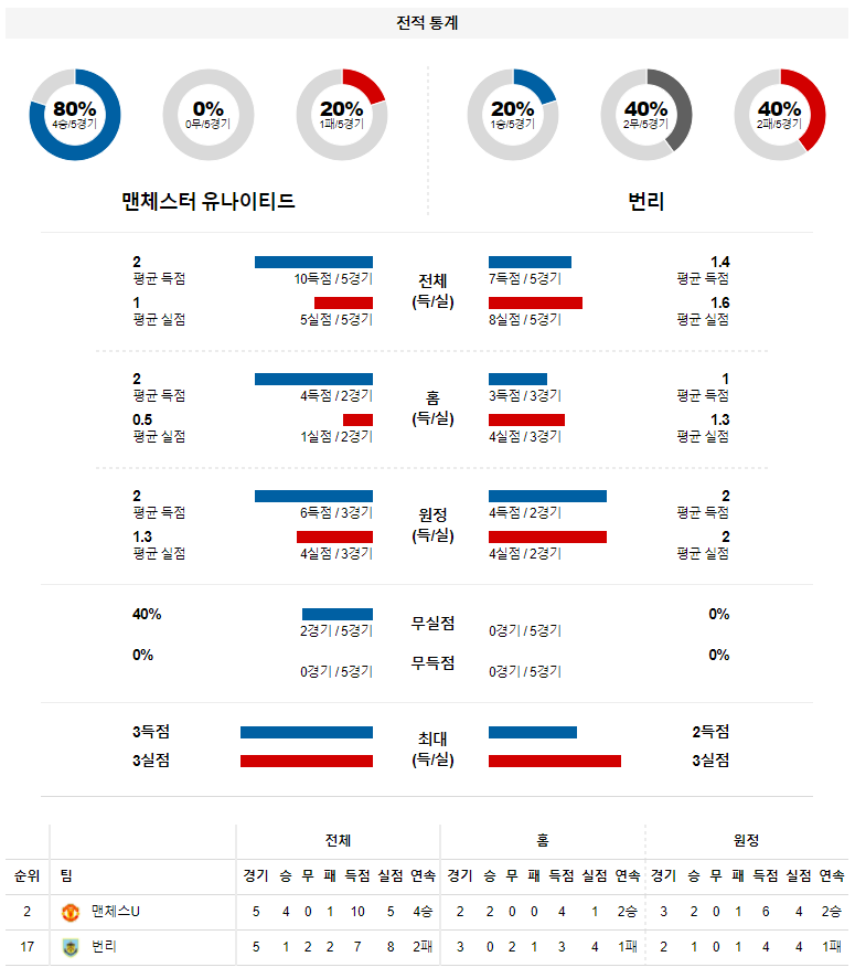 2. 맨체스터 유나이티드 이번 시즌 홈 성적 : 15전 8승 3무 4패 (무실점 비율 : 40%, 무득점 비율 : 20%)