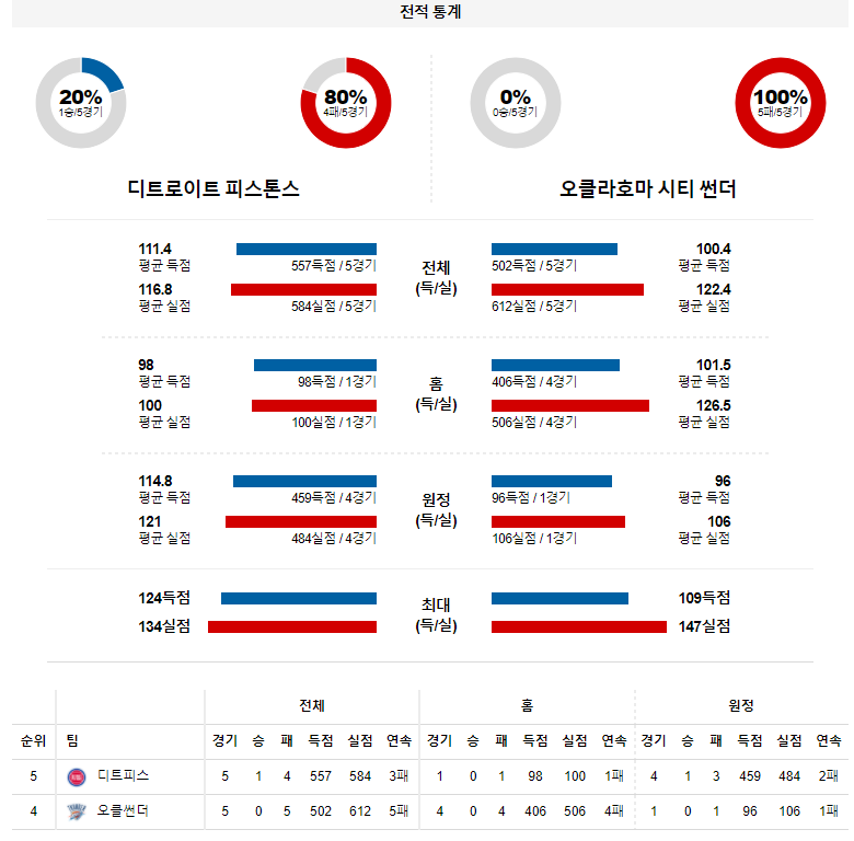 오클라호마는 핵심 선수들의 이탈로 전력이 많이 약해진 모습 이다. 또한, 공격 리바운드 허용후 세컨 득점을 연속 허용하는 횟수가 늘어나고 있다. 디트로이트 승리 가능성을 추천 한다.