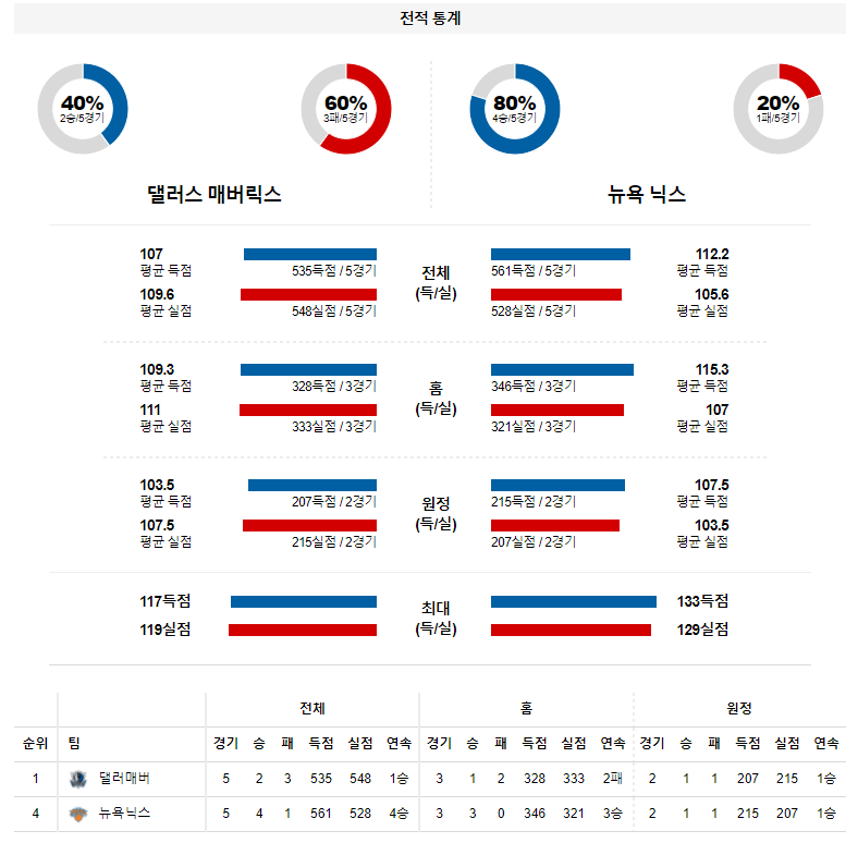 4연승을 만들어 낸 뉴욕 이지만 원정에서는 뒷심이 2% 부족했다. 돈치치가 절정의 경기력을 선보이고 있는 댈러스 승리 가능성을 추천 한다.