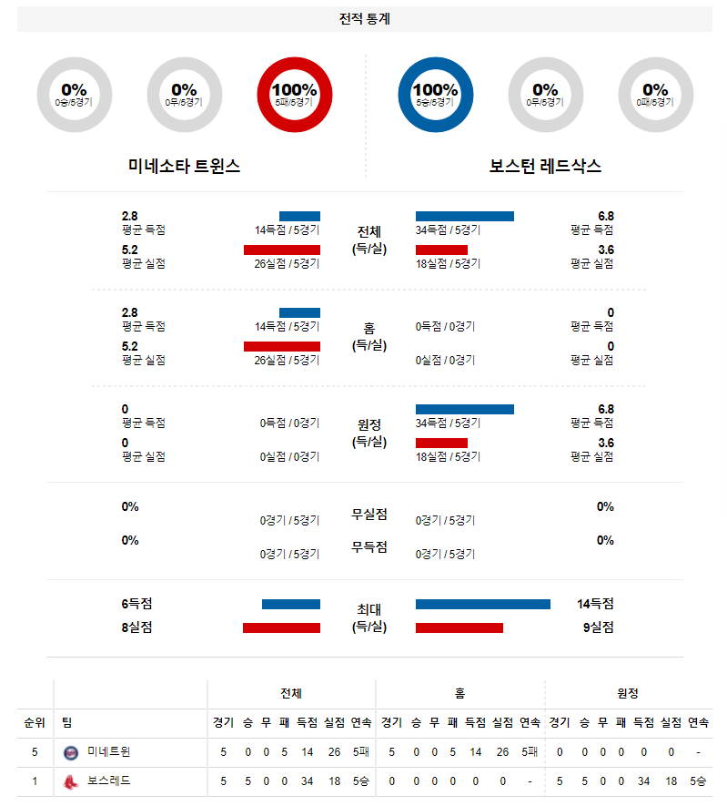 직전 경기에서 7-1 승리를 거둔 보스턴은 개럿 리처즈를 앞세워 기세를 이어가려 한다. 리처즈는 지난 볼티모어 전에서 5이닝 3피안타 2피홈런 3사사구 4탈삼진 2실점을 기록하며 안정적인 피칭을 선보였다. 하지만 올 시즌 2경기에 나와 1패 ERA 10.29를 기록하며 최악의 피칭을 선보이고 있는 만큼 이번 경기에서 무너질 가능성이 충분하다. 그나마 다행인 점은 직전 경기에서 개럿 위틀록과 에두아르드 바자르도가 무실점 피칭을 선보였다는 것이다.