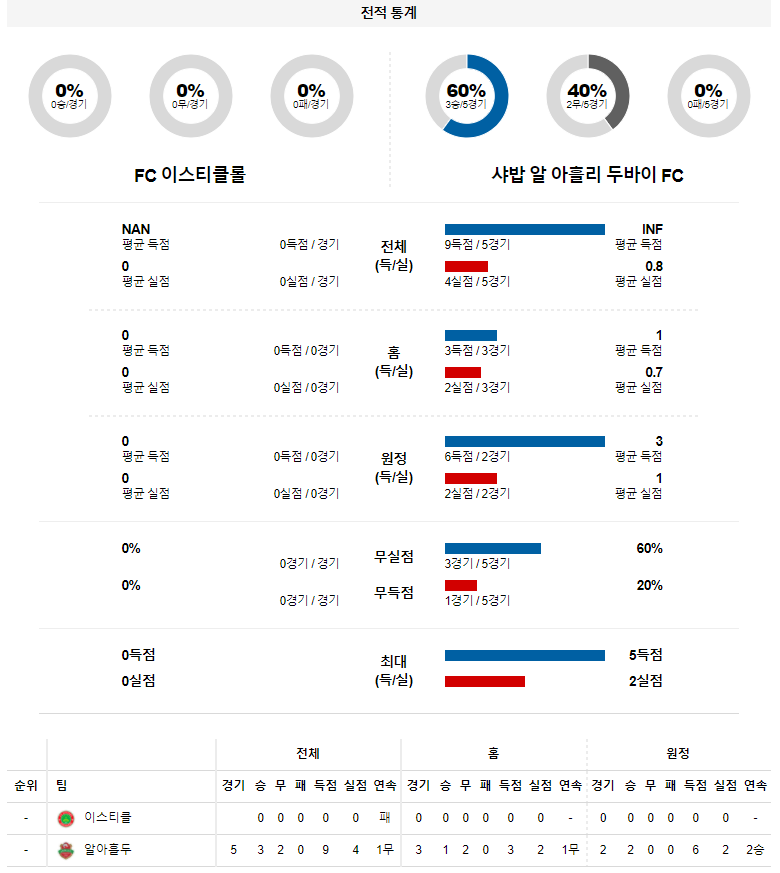 2. 이스티크롤 이번 시즌 홈 성적 : 3전 2승 0무 1패 (무실점 비율 : 33%, 무득점 비율 : 33%)