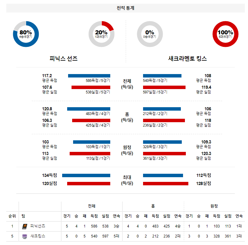 새크라멘토는 터프한 3점슛 시도가 많은 모습이고 피닉스는 오픈찬스를 만들고 3점슛을 시도한다. 화력의 차이가 나타날 것이다. 피닉스 승리 가능성을 추천 한다.