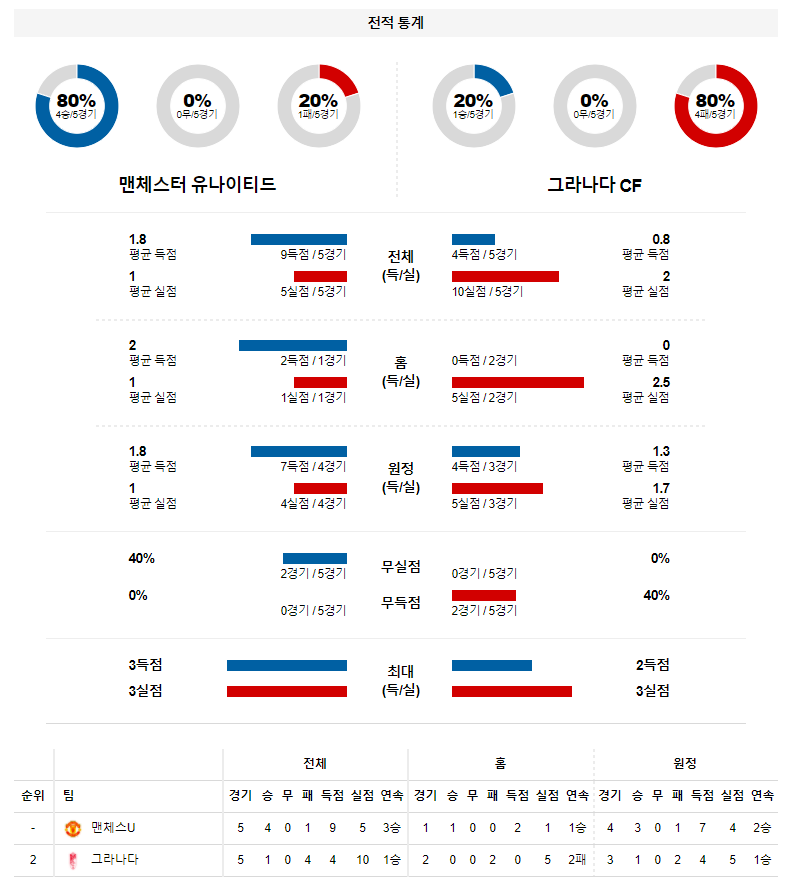 2. 맨체스터 유나이티드 이번 시즌 홈 성적 : 5전 2승 2무 1패 (무실점 비율 : 40%, 홈 무득점 비율 : 20%)