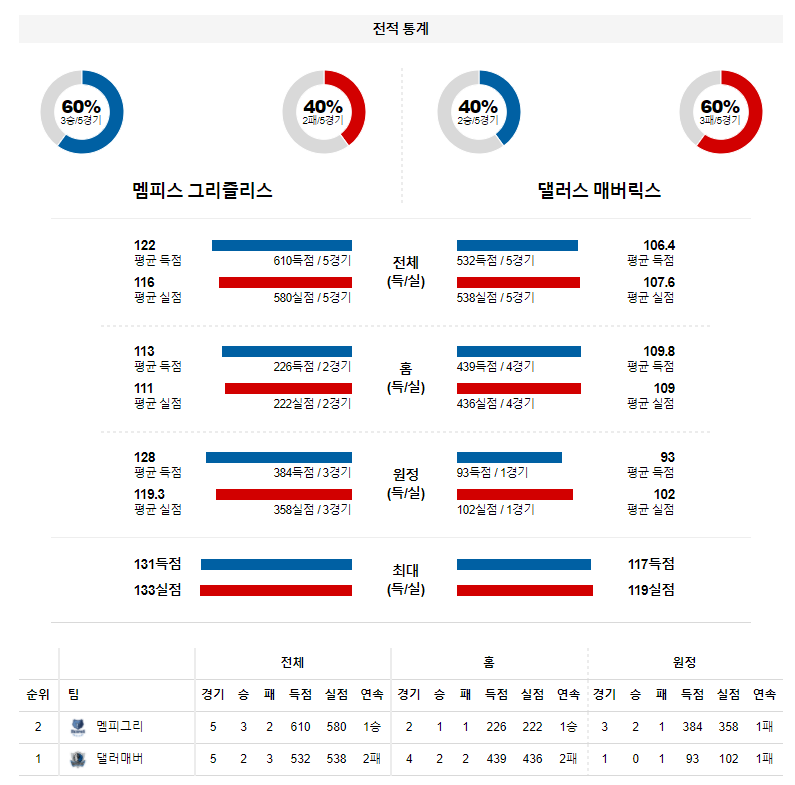 멤피스는 발렌슈나스의 인사이드 공략을 앞세워 최근 안정적인 득점력을 선보이고 있다. 반면 댈러스는 돈치체에게만 의존하는 모습을 보이며 밸런스가 무너진 상태이고, 돈치치의 확실한 조력자도 없다. 멤피스가 승리할 전망이다.