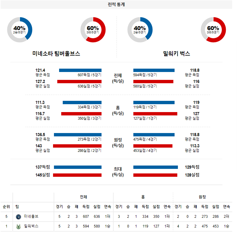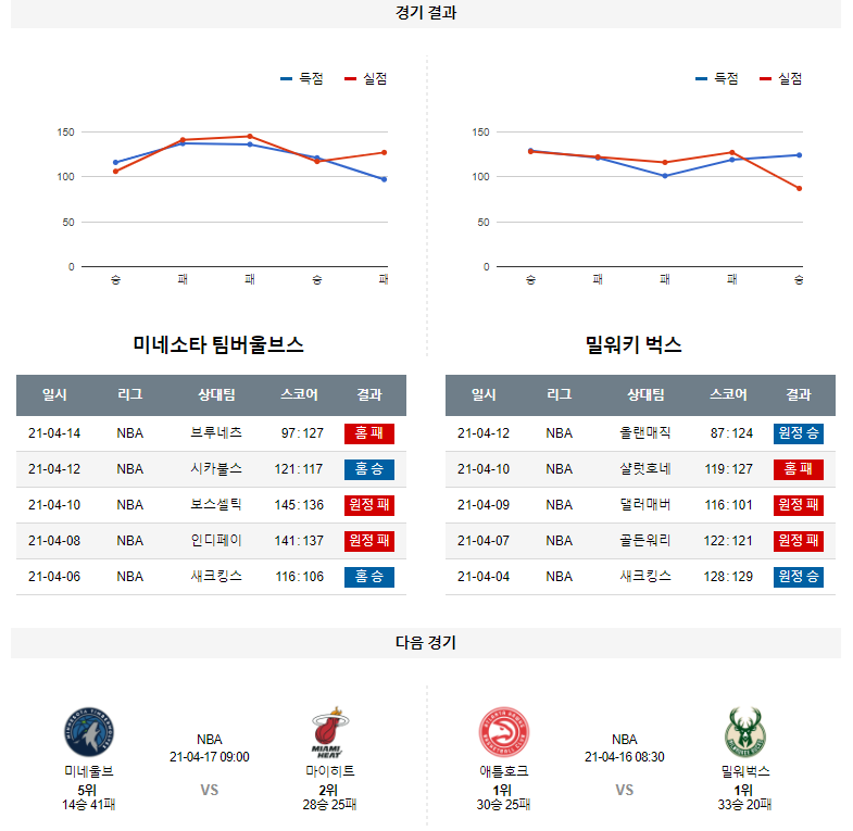 미네소타가 최근 꾸준한 득점력을 자랑하고 있지만 여전히 수비가 불안한 모습을 보이고 있다. 반면 밀워키는 계속해서 아테토쿤보가 결장하고 있지만 대체 자원들의 활약이 쏠쏠하다. 밀워키가 승리할 전망이다.