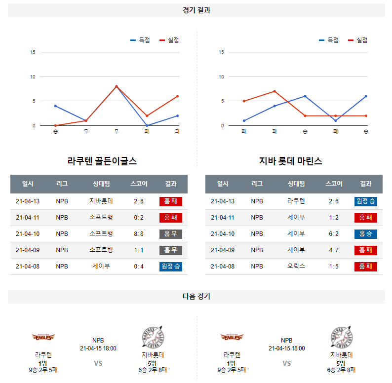 전일 경기에서는 지바롯데가 6-2 승리를 기록하며 시리즈 기선제압에 성공했다. 시즌 6승2무8패 성적. 8안타(1홈런)을 기록했고 선발 이시카와 아유무 투수의 7이닝 1실점 승리투가 나온 경기. 반면, 라쿠텐은 2연패 흐름 속에 9승2무5패 성적. 수비 실책이 연달아 나오면서 허용하지 않아도 되는 4실점을 헌납했고 11안타를 기록하고 2득점에 그치는 답답한 결정력이 나타난 경기.