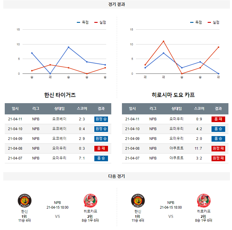 한신은 일요일 원정에서 요코베이 상대로 3-2 승리를 기록하며 시리즈 3승을 기록했다. 3연승 흐름 속에 시즌 11승4패 성적. 두 자리수 안타를 기록하는 가운데 조 건켈 투수가 6.1이닝 1실점 투구로 3연속 선발승을 기록하며 마운드 힘 싸움에서 우위를 점령한 경기. 반면, 히로카프는 일요일 홈에서 요미우리 상대로 0-9 패배를 기록하며 시리즈 2승1패를 기록했다. 2연승이 중단 되는 패배가 나왔으며 시즌 8승1무5패 성적. 선발 노무라 유스케 투수가 4이닝을 채우지 못하고 5실점을 허용하며 무너졌고 8개 잔루를 남긴 타선은 이마무라 노부타카 투수에게 완봉을 당했던 하루.
