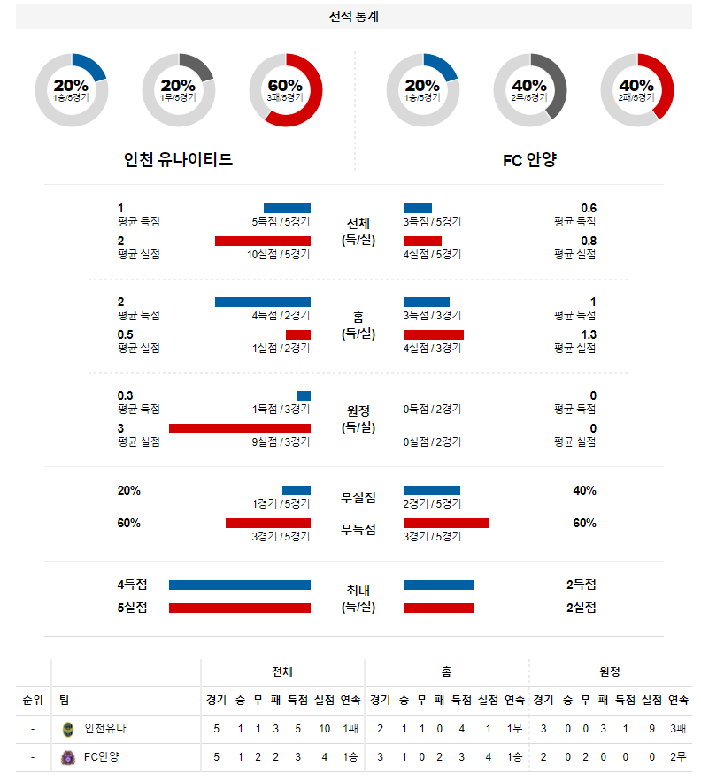 2. 인천 이번 시즌 홈 성적 : 4전 2승 1무 1패 (무실점 비율 : 25%, 홈 무득점 비율 : 50%)