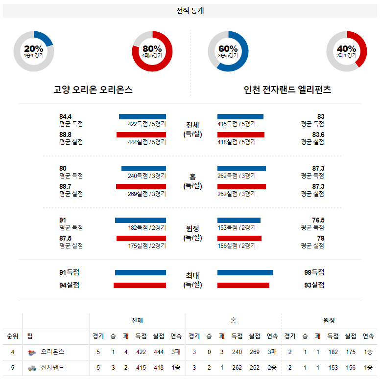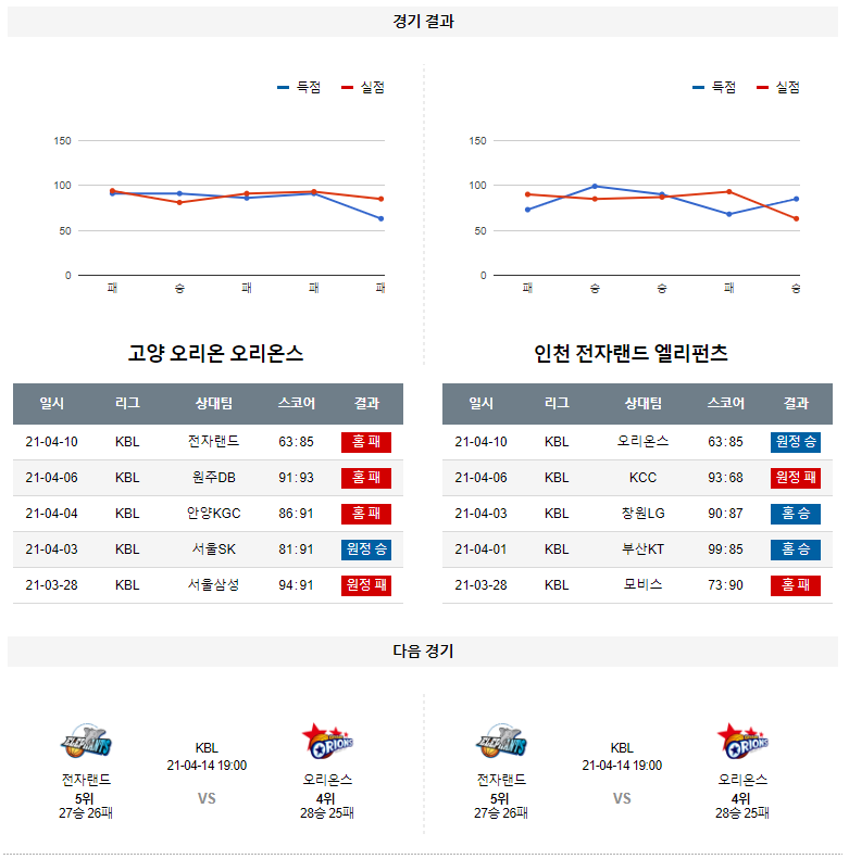 4월 12일 오리온스 전자랜드 분석 KBL 농구
