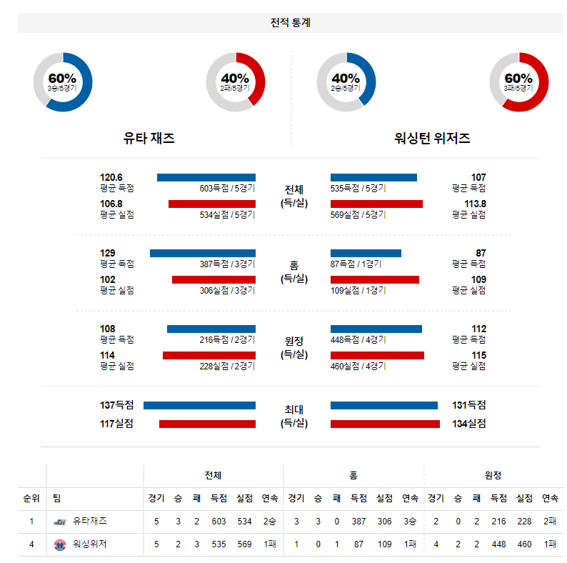 유타는 매 경기 안정적인 공수 밸런스를 선보이고 있다. 장기인 3점슛이 통하지 않을 때는 인사이드를 공략하는 모습까지 보이고 있다. 반면 워싱턴은 웨스트브룩만 바라보는 경기만 반복되고 있다. 유타가 승리할 전망이다.