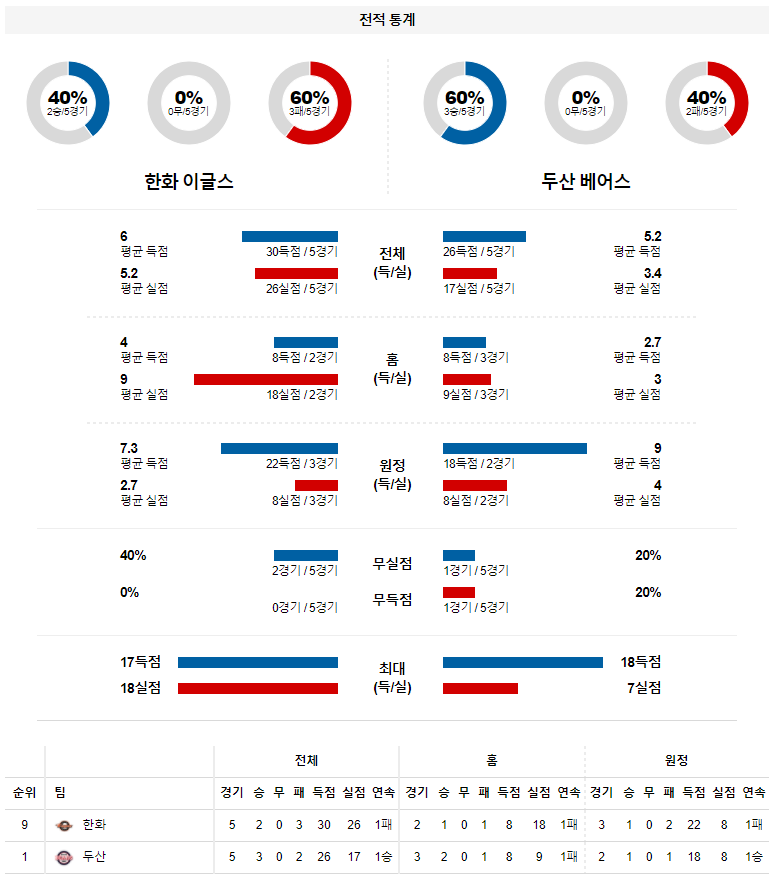 카펜터는 안정적이지만 한화의 불펜진이 직전 경기에서 완전히 무너졌다. 직전 경기에서 홈런을 터트린 김재환*과 양석환을 막지 못할 가능성이 높다. 반면 최원준은 한화를 상대로 강했다. 직전 경기에서 멀티 히트를 기록한 강경학을 막아내며 두산이 승리할 전망이다.