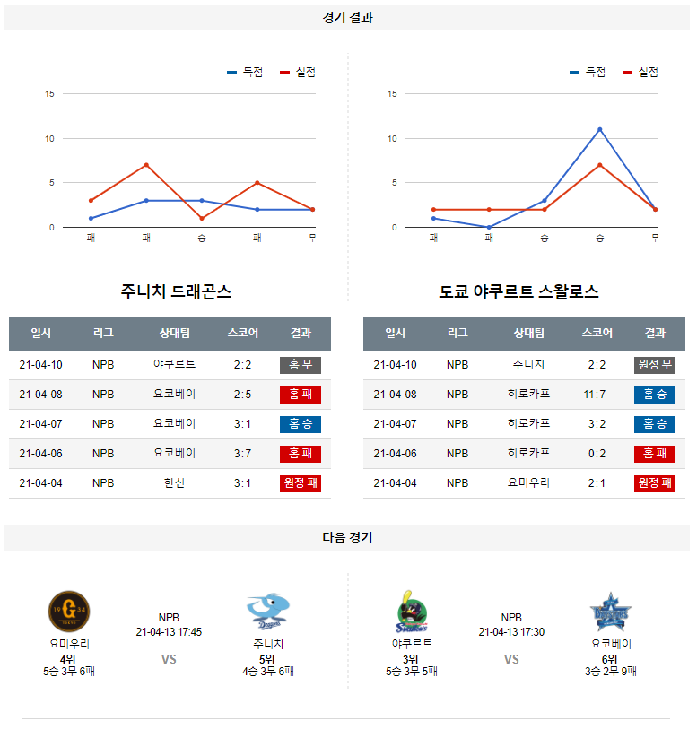 4월 11일 주니치 야쿠르트 분석 NPB 일본 프로야구