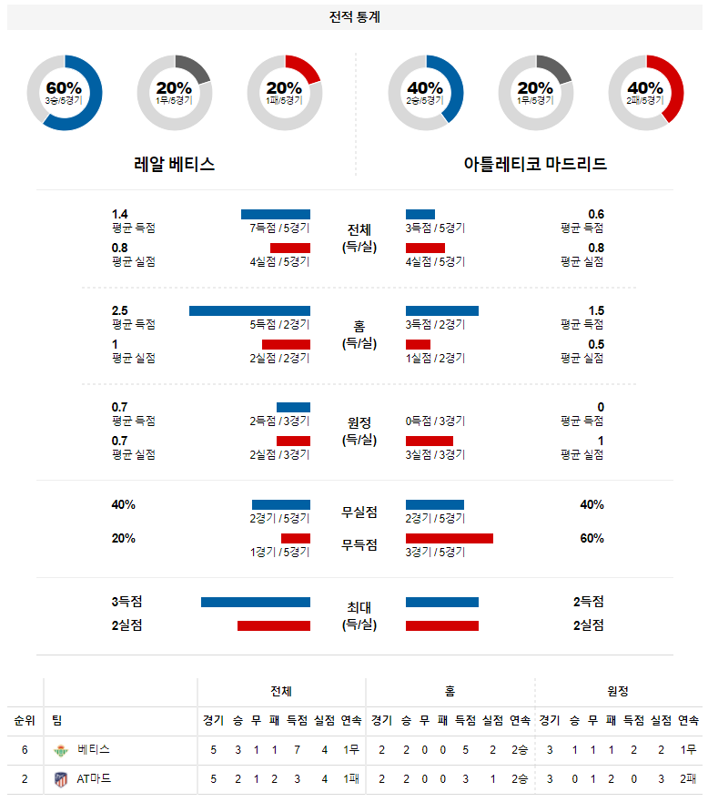 2. 레알 베티스 이번 시즌 홈 성적 : 14전 8승 2무 4패 (무실점 비율 : 35%, 무득점 비율 : 14%)