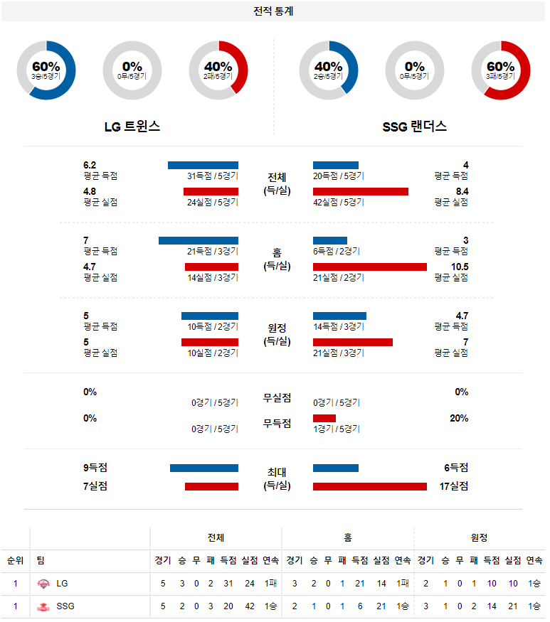 수아레즈는 첫 등판부터 완벽한 피칭을 선보였다. 직전 경기에서 멀티 히트를 기록한 최주환과 제이미 로맥을 막아낼 가능성이 충분하다. 반면 SSG는 박중훈이 안정적이지만 불펜진이 불안하다. 직전 경기에서 홈런을 터트린 로베르토 라모스와 오지환을 막지 못하며 LG가 승리할 전망이다.
