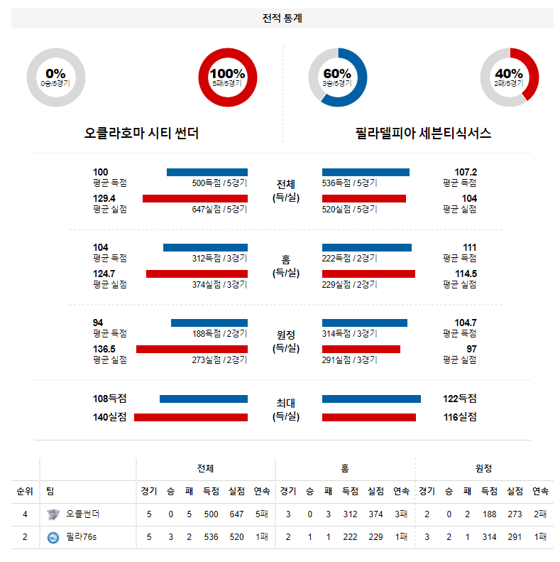 오클라호마는 핵심 선수들의 이탈로 전력이 많이 약해진 모습 이다. 또한, 공격 리바운드 허용후 세컨 득점을 연속 허용하는 횟수가 늘어나고 있다. 필라델피아 승리 가능성을 추천 한다.