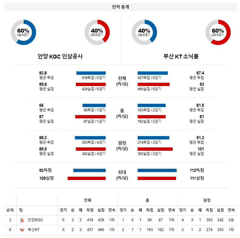 5라운드 맞대결 에서는 부산 KT가 홈에서 95-89 승리를 기록했다. 허훈이 18득점, 13어시스트를 폭발시키며 상대 코트를 휘젓고 다녔고 100% 3점슛 성공률(3/3)을 기록한 양홍석(16득점, 11리바운드)이 더블-더블을 기록하며 팀 공격을 이끌었던 경기. 13개 3점슛을 68.4%의 높은 적중률 속에 림에 꽂아 넣었으며 브랜든 브라운과 클리프 알렉산더는 수비에서 높은 공헌도를 보여준 상황. 반면, 안양 KGC인삼공사는 제러드 설린저가 26여분 4초의 출전 시간 동안 25득점, 2어시스트, 12리바운드를 기록했고 78%(7/9)의 3점슛 성공률 속에 커리어 하이 득점을 기록한 전성현(29득점)이 슈터로선 더할나위 없이 좋은 활약을 펼쳤지만 나머지 선수들의 화력 지원이 부족했던 경기. 수비에는 강점이 있지만 공격력에 아쉬움이 있는 문성곤(38분28초 출전 => 무득점), 양희종(17분 23초 출전 => 무득점)의 모습이 나타나면서 분위기를 끌어올릴수 없었던 상황.
