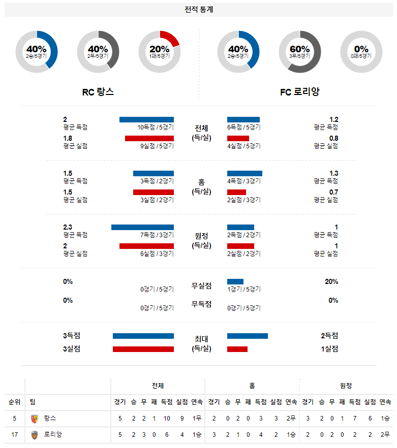 2. 랑스 올 시즌 홈 성적 : 15전 5승 6무 4패 (무실점 비율 : 20%, 무득점 비율 : 20%)