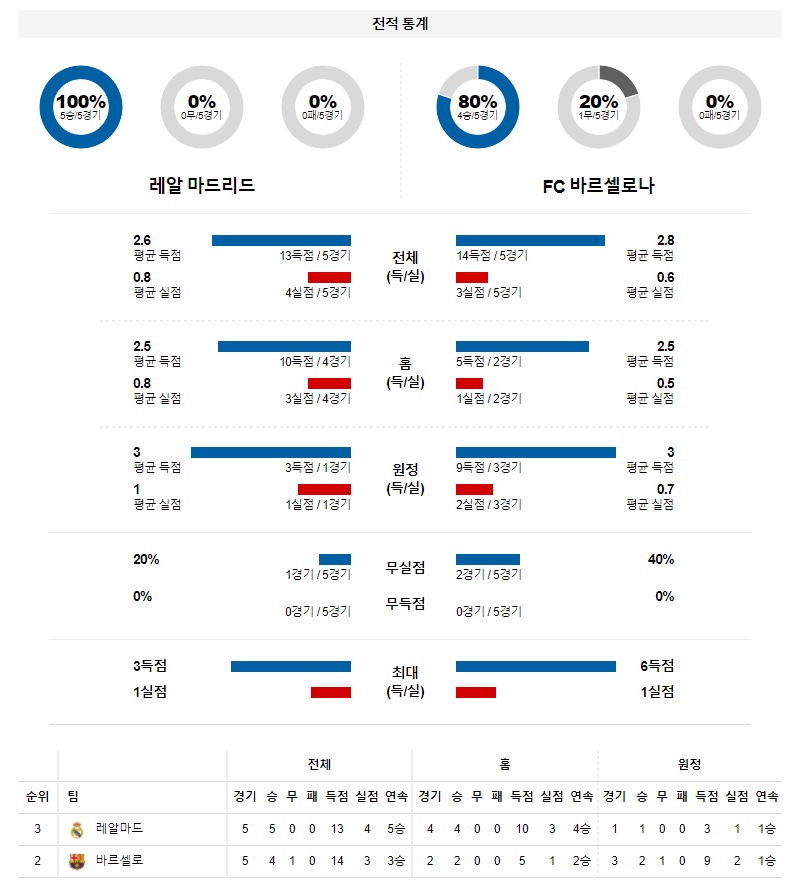 2. 레알 마드리드 이번 시즌 홈 성적 : 6전 1승 2무 3패 (무실점 비율 : 50%, 홈 무득점 비율 : 7%)