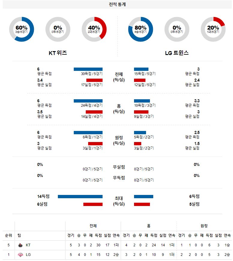 복귀전에 대한 부담감이 고영표 투수에게 문제가 될수 있는 경기. 지난시즌 QS의 비중이 높았던 정찬헌 투수가 선발 싸움에서 우위에 있다고 생각되며 불펜 싸움에서도 LG의 근소한 우세가 예상되는 경기. LG 승리 가능성을 추천 한다.