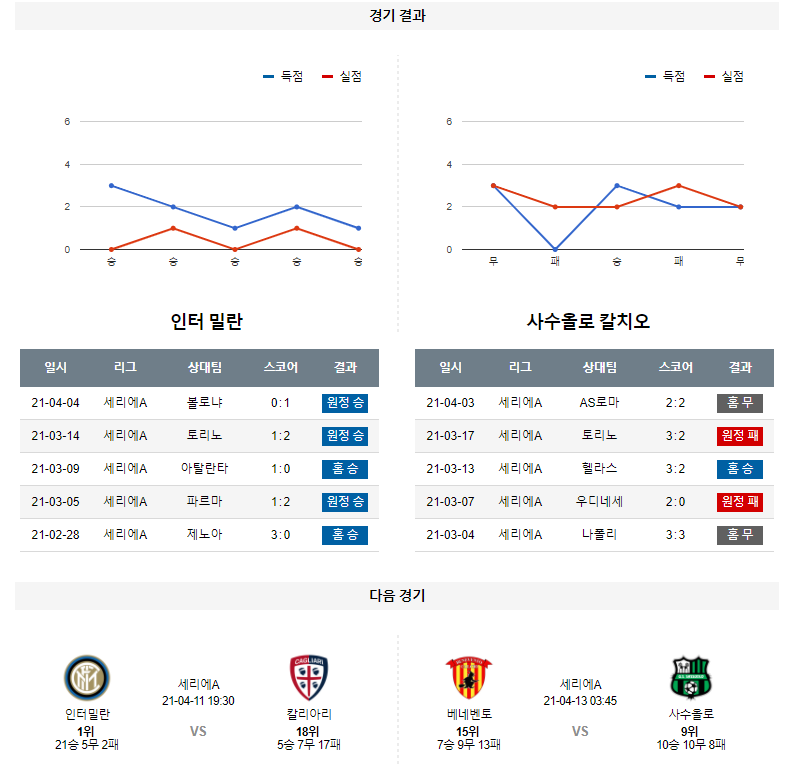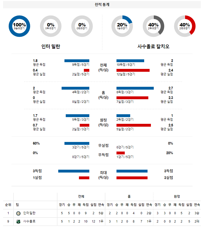 1. 최근 6경기 맞대결 : 6전 2승 2무 2패 11득점 9실점 (동률, 인터밀란 기준)