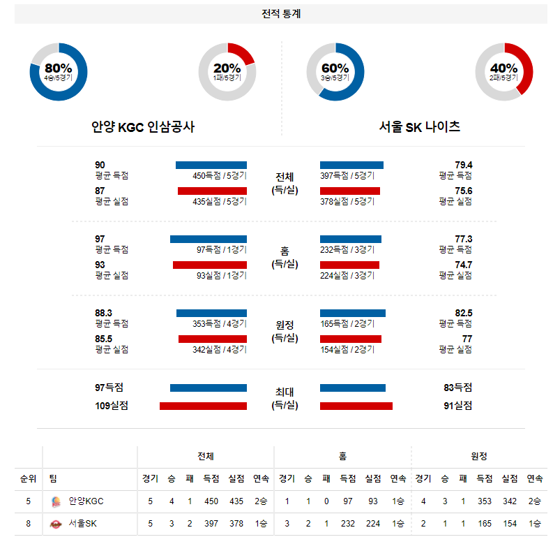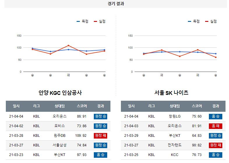 안양 KGC인삼공사는 직전경기(4/4) 원정에서 고양 오리온 상대로 91-86 승리를 기록했으며 이전경기(4/2) 원정에서 울산 모비스 상대로 86-73 승리를 기록했다. 원주DB 상대로 4연승이 중단 되는 패배가 나왔지만 연패를 막고 다시금 2연승을 기록하면서 상승세 리듬을 이어갈수 있게 되었으며 시즌 30승23패 성적. 고양 오리온 상대로는 제러드 설린저가 26득점, 15리바운드를 기록하며 펄펄 날았고 턴오버(5개)를 최소화 하는 집중력을 보여준 것이 마지막에 웃을수 있는 힘이 되어준 경기. 상대의 협력 수비에 당황하지 않고 동료들의 찬스를 부지런히 만들어 주는 설린저의 이타적인 플레이가 팀에 긍정의 나비효과를 불러오면서 토종 선수들의 손끝에서도 신바람이 불었던 상황. 또한, 이재도(18득점), 오세근(12득점), 변준형(12득점), 전성현(16득점, 3점슛 2개)이 2경기 연속 두 자리수 득점을 기록한 승리의 내용.