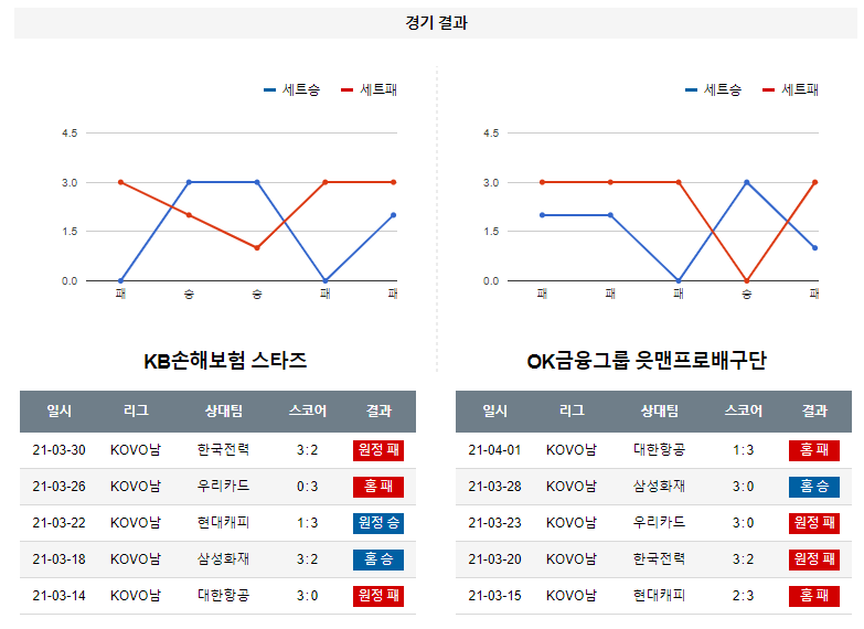 정규시즌 3승3패의 성적으로 백중세를 보였던 두 팀 이며 3세트 승부=>1회, 4세트 승부 =>3회, 5세트 승부 =>2회가 나왔고 듀스가 출현한 세트는 2개 세트에 불과했다. 두 팀 모두 세트별 경기력의 기복이 심한 만큼 3세트 승부의 가능성은 떨어지지만 버티는 힘이 약한 탓에 세트를 빼앗기는 상황에서는 무너지는 경기가 많고 한번 흐름을 빼앗기면 반전 시킬수 있는 뒷심이 부족한 만큼 풀세트 접전의 가능성도 떨어진다고 생각되는 경기다.