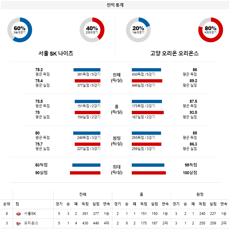 SK가 직전 경기에서 깜짝 승리를 따냈지만 매 경기 꾸준한 경기력을 선보일 수 있는 수준의 팀이 아니다. 반면 오리온은 윌리엄스가 살아나며 확실한 반등 포인트가 생겼다. 오리온이 승리를 따낼 전망이다.