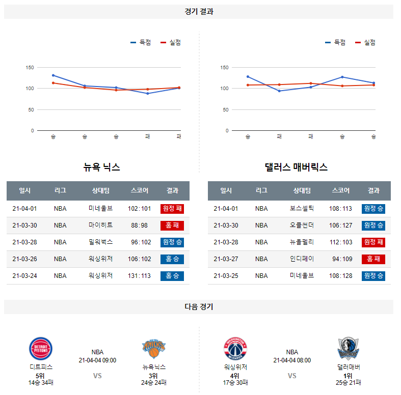 댈러스의 우세가 예상되지만 지난시즌 상대전에서 연승을 만들어 낸 뉴욕 이였다는 것을 핸디캡 승부에서 참고해야 한다. 아군에서 적으로 만난 크리스탑스 포르징기스 앞에서 승리를 놓칠수 없다는 승리에 대한 강한 의지가 리바운드 싸움에서 우위로 나타난 기억이 있는 지난 시즌 맞대결의 내용. 또한, 다음날 두 팀 모두 디트로이트(뉴욕)와 워싱턴(댈러스)을 상대로 백투백 일정을 위해서 힘을 분산해야 하는데 댈러스 식스맨들의 경기력 기복 현상이 아직은 유효 하다고 생각 된다.