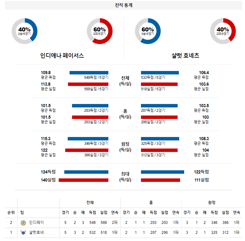 올시즌 상대전에서는 1차전 인디애나(원정) 10점, 2차전 샬럿(홈) 3점차 승리의 결과가 나오면서 1승1패를 기록중이다. 2차전에서 가동되지 않았던 리스 르버트의 합류가 인디애나에게 힘이 되어줄 것이며 샬럿은 2차전 당시 16득점 7어시스트 6리바운드 2스틸을 기록한 라멜로 볼이 결장한다.
