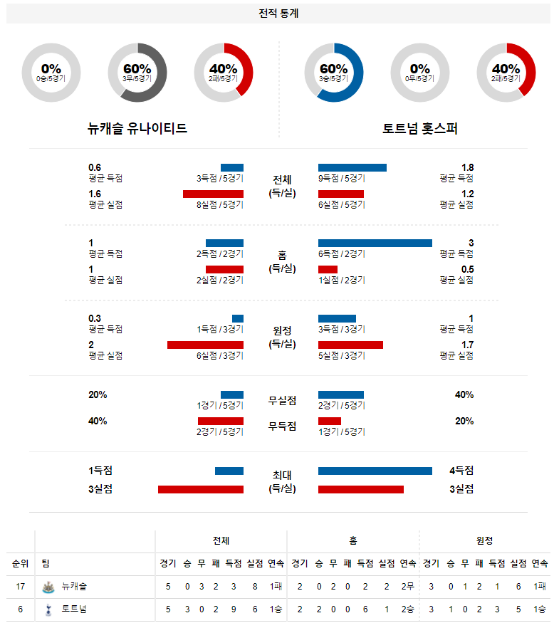 2. 뉴캐슬 이번 시즌 홈 성적 : 14전 4승 4무 6패 (무실점 비율 : 7%, 무득점 비율 : 21%)