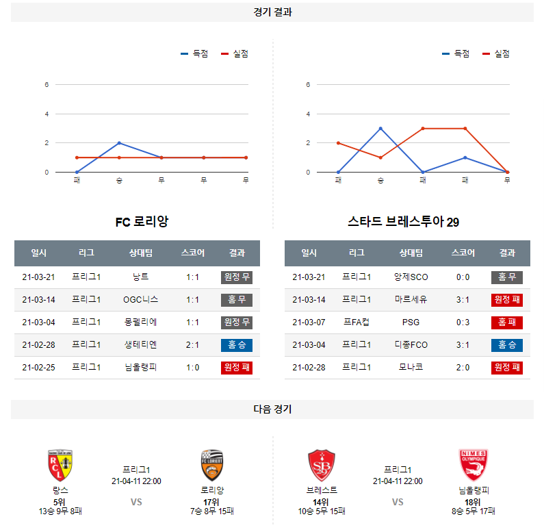 4월 4일 로리앙 브레스트 분석 프랑스 리그-1 축구