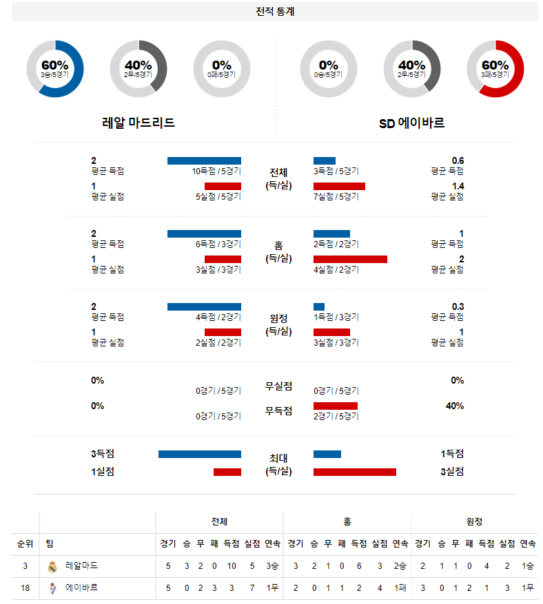 1. 최근 5경기 맞대결 : 5전 4승 0무 1패 (레알 마드리드 우세)
