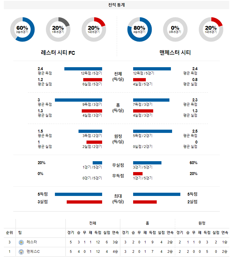 1. 최근 5경기 맞대결 : 5전 2승 0무 3패 (맨시티 우세)