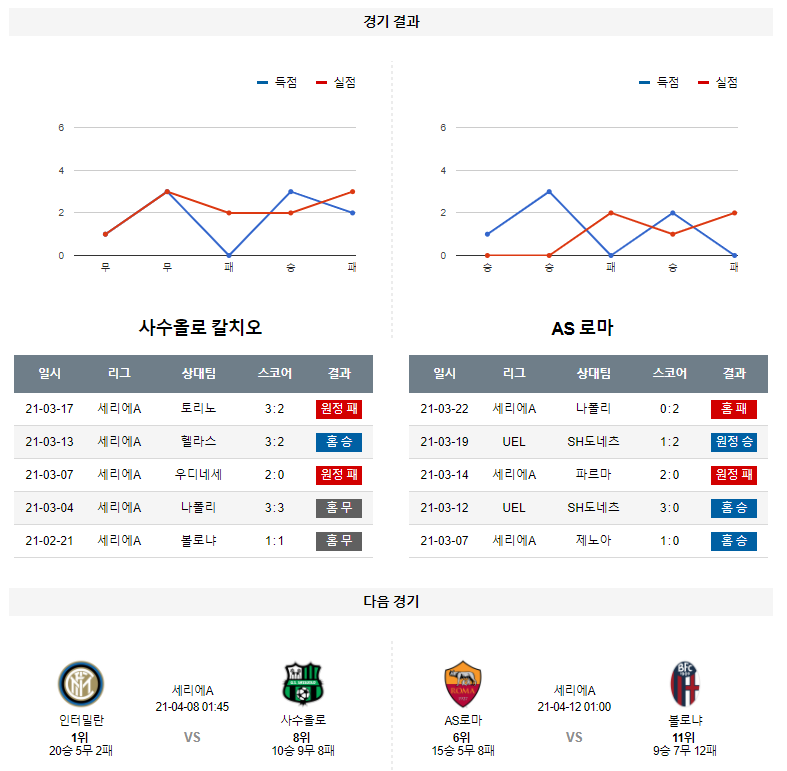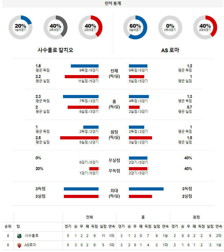 1. 최근 6경기 맞대결 : 6전 3승 2무 1패 10득점 7실점 (로마 우세)