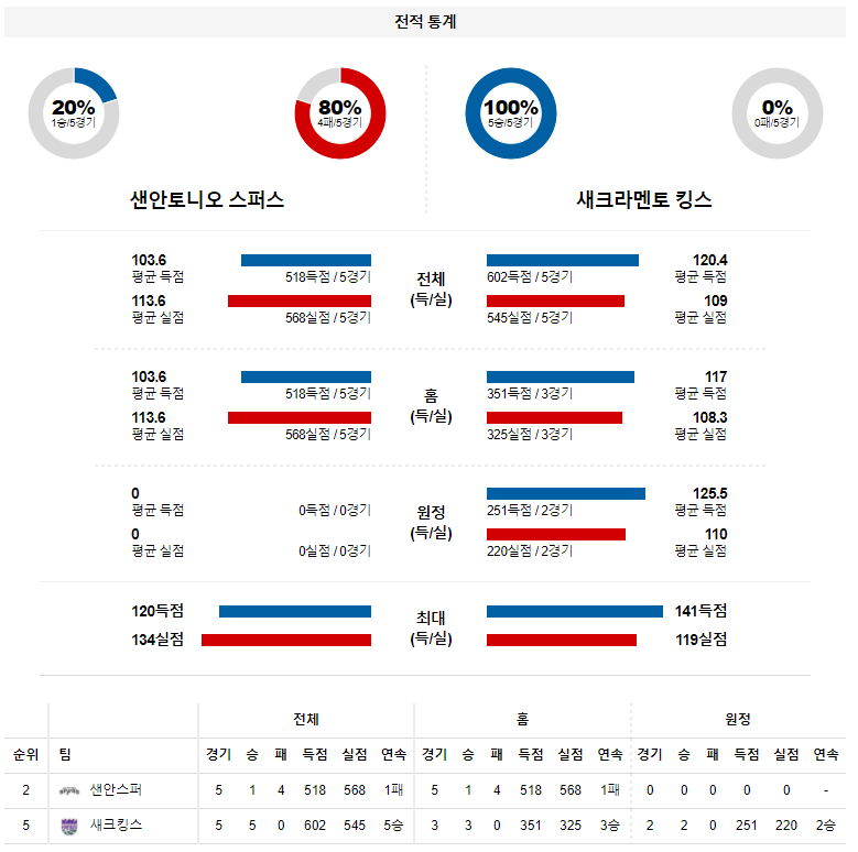 샌안토니오는 최근 드로잔, 화이트 같은 주축 선수들이 부진에 빠지며 제대로 된 경기력을 선보이지 못하고 있다. 반면 새크라멘토는 배글리 3세가 부상을 당한 이후 수비력이 좋아졌고, 할리버튼이 주전 라인업에 합류한 이후 공격력까지 상승했다. 새크라멘토가 승리할 전망이다.