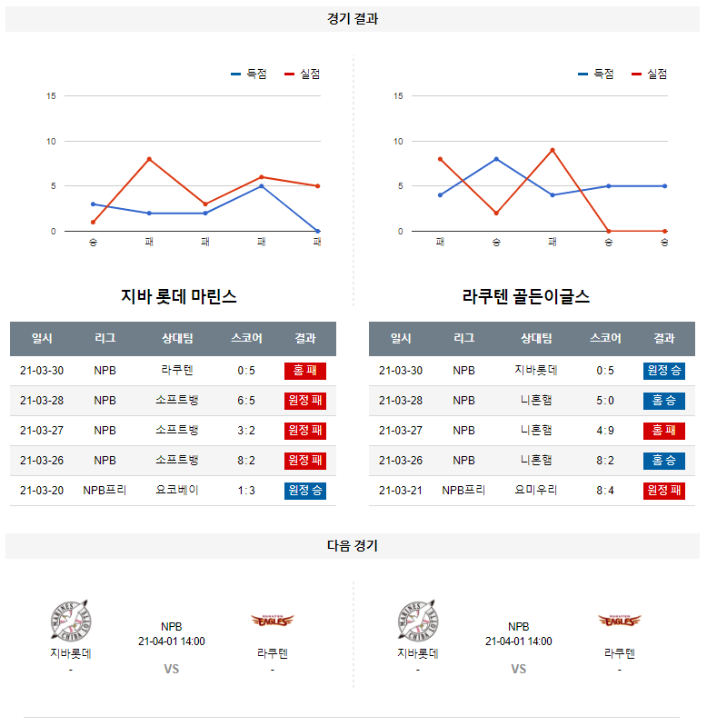 전일 경기에서는 라쿠텐이 5-0 승리를 기록하며 시리즈 기선제압에 성공했다. 2연승 흐름 속에 시즌 3승1패 성적. 선발 기시 다카유키 투수가 완봉승을 기록하며 상대전 천적으로서 모습을 이어갔고 7안타(2홈런)을 기록한 경기. 반면, 지마롯데는 시즌 4연패 성적의 부진한 출발. 8안타 경기를 했지만 잔루 대마왕의 경기를 했던 하루.